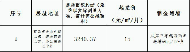 七、報(bào)名時(shí)間:自2023年7月4日起至2023年7月10日止,發(fā)布公告之日起7個(gè)工作日為一個(gè)競(jìng)拍周期,每個(gè)競(jìng)拍周期滿后若收到超過3人報(bào)名則組織競(jìng)拍,若未收到3人報(bào)名則進(jìn)入下一個(gè)競(jìng)拍周期,將在南昌金開集團(tuán)有限公司微信公眾號(hào)公布租賃商務(wù)條款的調(diào)整信息。