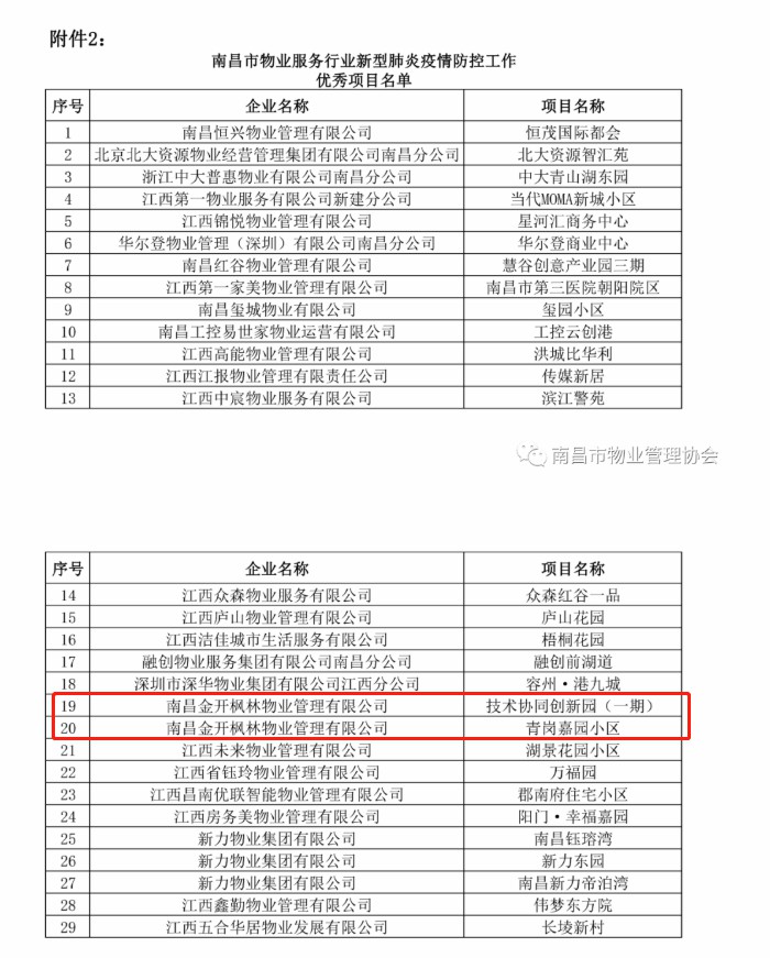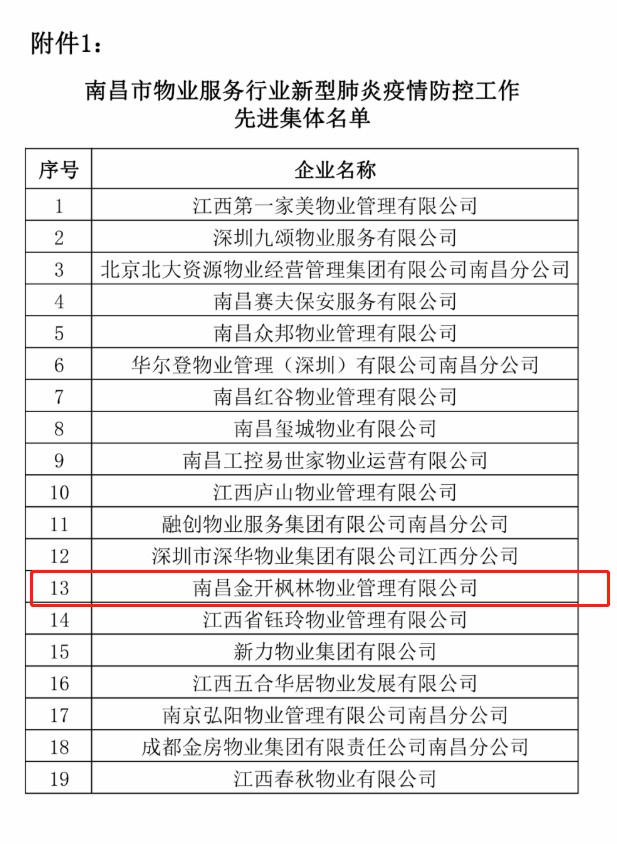 2022年6月22日,南昌市物業(yè)管理協(xié)會發(fā)布了《關(guān)于通報表彰南昌市物業(yè)服務(wù)行業(yè)新型肺炎疫情防控工作先進(jìn)的通知》,其中,南昌金開楓林物業(yè)管理有限公司榮獲了南昌市物業(yè)服務(wù)行業(yè)新型肺炎疫情防控工作先進(jìn)集體,公司管轄的技術(shù)協(xié)同創(chuàng)新園(一期)和青嵐嘉園小區(qū)榮獲了市物業(yè)服務(wù)行業(yè)新型肺炎疫情防控工作優(yōu)秀項目!