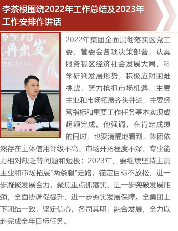會(huì)上,集團(tuán)財(cái)務(wù)部(融資部)、工程技術(shù)部及各子公司作了述職報(bào)告,總結(jié)了2022年工作,分析了工作中存在的問(wèn)題和困難,重點(diǎn)謀劃了2023年工作。