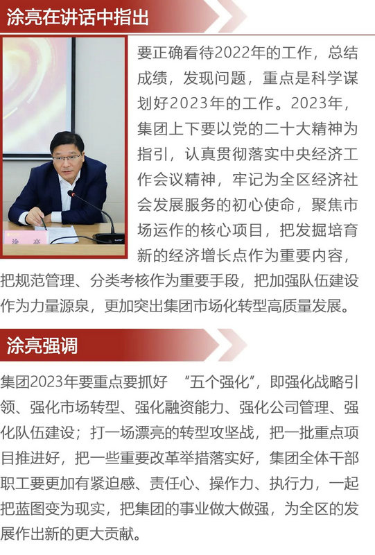 1月12日上午,金開(kāi)集團(tuán)召開(kāi)2023年度工作務(wù)虛會(huì),總結(jié)分析2022年主要工作情況,科學(xué)謀劃2023年工作。區(qū)黨工委委員、管委會(huì)副主任賀敏,集團(tuán)黨委書(shū)記、董事長(zhǎng)涂亮,集團(tuán)黨委副書(shū)記、總經(jīng)理李茶根出席會(huì)議并講話。集團(tuán)黨委委員、副總經(jīng)理胡應(yīng)庚主持會(huì)議。集團(tuán)領(lǐng)導(dǎo)班子成員熊永賦、黃新強(qiáng)、萬(wàn)居易、羅進(jìn)群,集團(tuán)工會(huì)主席袁扣華,集團(tuán)部長(zhǎng)助理及以上人員,各子公司副部長(zhǎng)及以上人員參加會(huì)議。