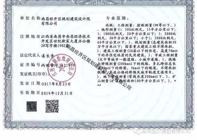 8月15日,從南昌市國土資源局傳來喜訊,南昌經(jīng)開區(qū)規(guī)劃建筑設計院有限公司順利通過市國土資源局的資質(zhì)升級審批,并于8月23日通過公示,成為丙級測繪資質(zhì)單位。9月5日,由江西省測繪地理信息局正式發(fā)放《丙級測繪資質(zhì)證書》。