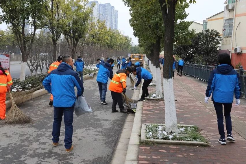 當(dāng)天,在領(lǐng)取鐵鍬、掃把等清掃工具后,胡順明、潘賢林等干部職工們?nèi)ν度氲叫l(wèi)生清理工作中,整個打掃場地一片熱火朝天的景象。經(jīng)過兩個多小時的清掃,洪城錦苑社區(qū)、軍民友誼路等地路面雜物及殘雪被清理干凈。