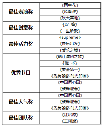 為表彰各公司在文藝匯演中的精彩表現(xiàn)和辛苦付出,周云、高艷分別為網(wǎng)絡(luò)票選評出的最佳人氣獎及最佳表演獎、最佳創(chuàng)意獎、最佳團隊獎、最佳活力獎、優(yōu)秀節(jié)目獎等團隊頒獎。