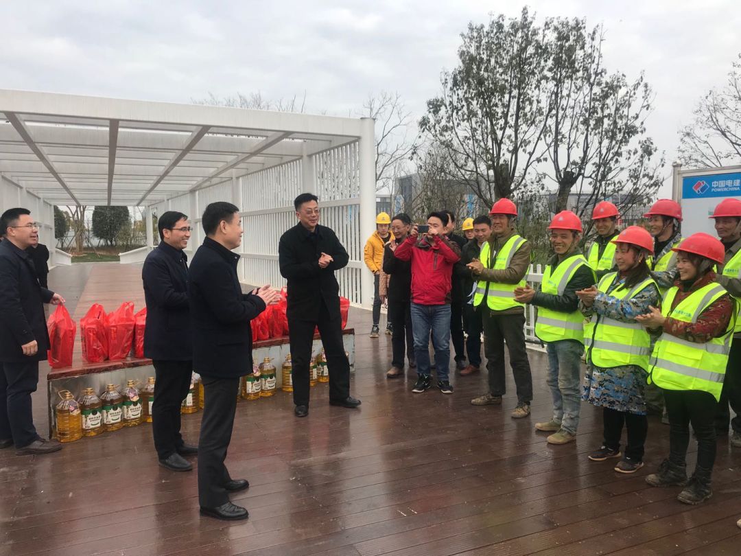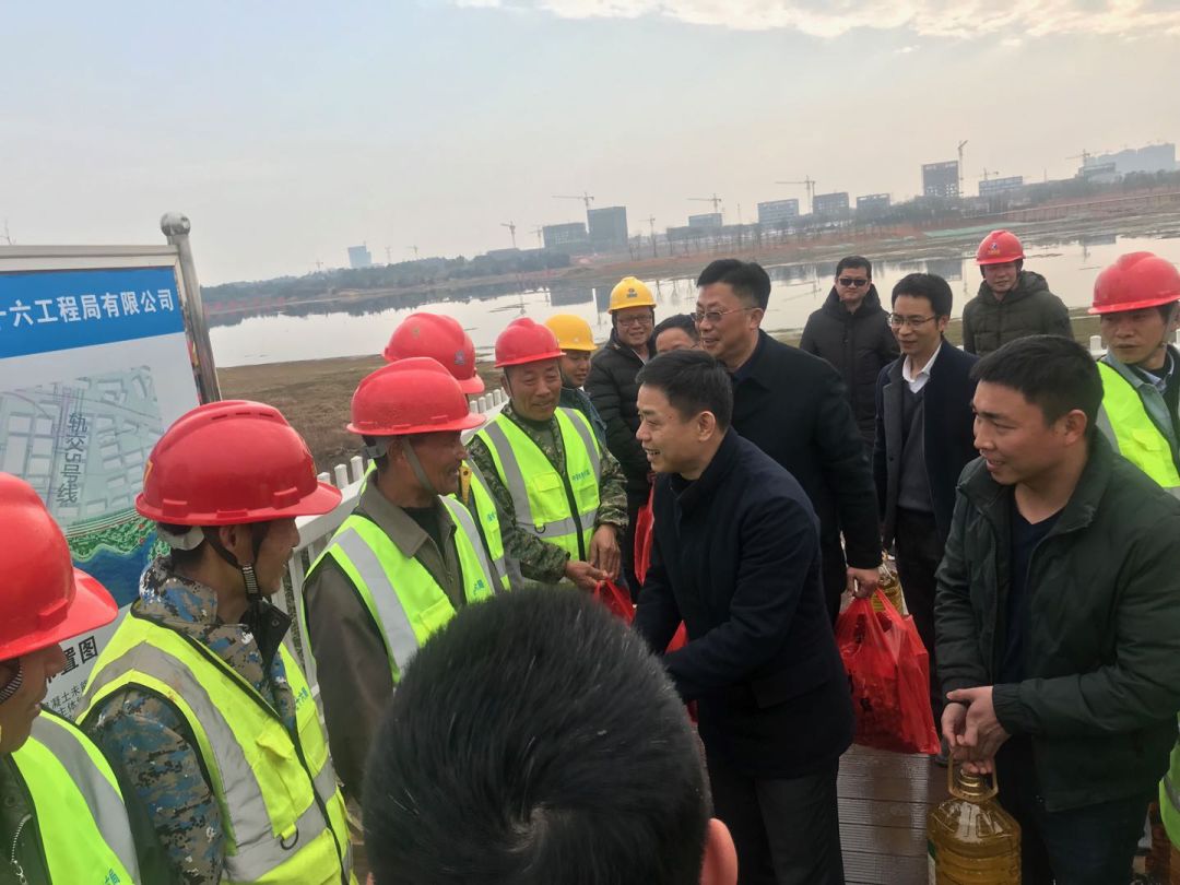 區(qū)黨工委副書記程建兵來到儒樂湖公園北岸慰問一線工人,向他們的辛勤勞動(dòng)給予鼓勵(lì)并致以節(jié)日的問候,并對下一步的工作進(jìn)行了布置。金開集團(tuán)總經(jīng)理潘賢林,副總經(jīng)理袁扣華、邊文彬,施工單位等相關(guān)人員陪同。