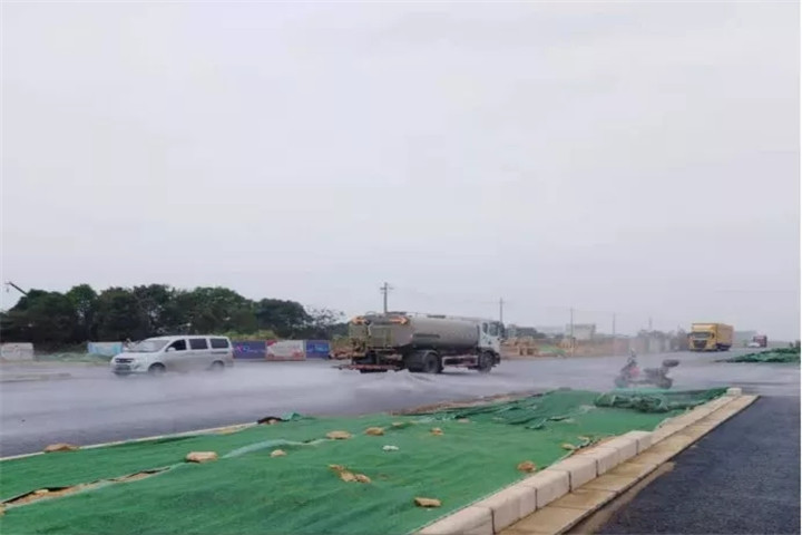 2、英雄大道全線裸土覆蓋,灑水車灑水降塵,確保工地?zé)o揚(yáng)塵;