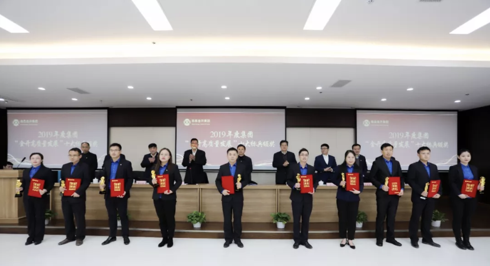 程建兵及集團領(lǐng)導(dǎo)班子為2019年度集團“金開高質(zhì)量發(fā)展”十大標(biāo)兵頒獎并合影留念。隨后,2名優(yōu)秀員工代表發(fā)表了獲獎感言。