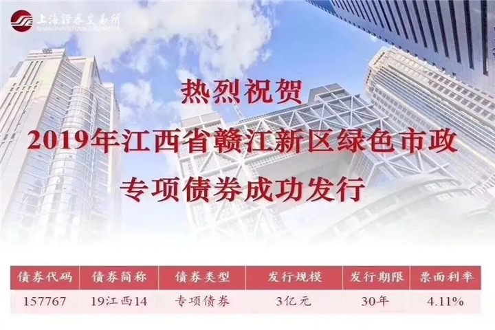 6月18日,江西省贛江新區(qū)綠色市政專項(xiàng)債券(一期)經(jīng)省政府批準(zhǔn)同意在上海證券交易所成功發(fā)行。本期債券發(fā)行金額3億元,信用評(píng)級(jí)AAA,期限30年,發(fā)行利率4.11%,繼去年4月江西省首單綠色私募可轉(zhuǎn)債落地經(jīng)開(kāi)區(qū)后,全國(guó)首單綠色市政專項(xiàng)債券成功落地南昌經(jīng)開(kāi)區(qū)(贛江新區(qū)經(jīng)開(kāi)組團(tuán))。