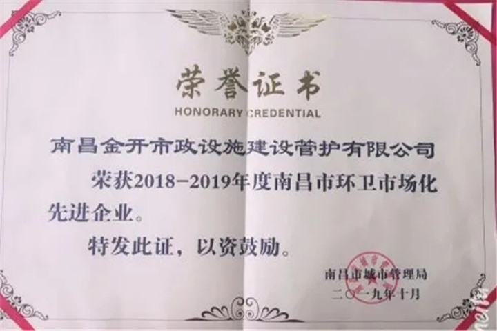 在2018至2019年度“南昌市環(huán)衛(wèi)市場(chǎng)化先進(jìn)企業(yè)”評(píng)選中,金開(kāi)集團(tuán)下屬管護(hù)公司以排名第一的成績(jī)從28個(gè)外包企業(yè)中脫穎而出,獲得“南昌市環(huán)衛(wèi)市場(chǎng)化先進(jìn)企業(yè)”稱號(hào)。