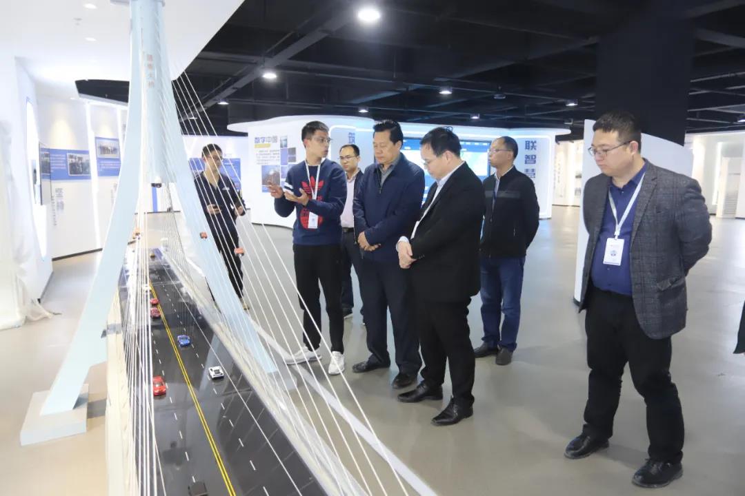 通慧集團董事長謝天長首先對謝榮華一行的來到表示熱烈歡迎,并詳細介紹了通慧集團的發(fā)展歷程。隨后,謝榮華一行來到其數(shù)字化展廳,重點對橋梁隧道健康監(jiān)測系統(tǒng)、VR安全教育系統(tǒng)、全息投影智慧工地視頻、港口集團智慧管理平臺等信息化系統(tǒng)進行了參觀學(xué)習(xí)。