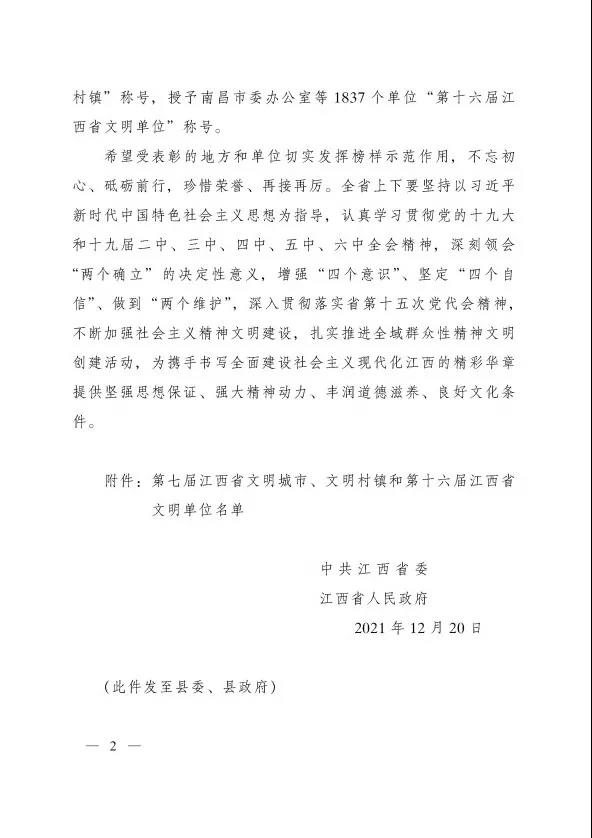 為充分發(fā)揮榜樣示范作用,大力培育和踐行社會主義核心價值觀,全面推進(jìn)公民道德建設(shè),進(jìn)一步調(diào)動全社會參與文明城市、文明村鎮(zhèn)、文明單位創(chuàng)建工作的積極性、主動性和創(chuàng)造性,12月20日,中共江西省委、江西省人民政府對“第七屆江西省文明城市”“第七屆江西省文明村鎮(zhèn)”“第十六屆江西省文明單位”進(jìn)行了通報表揚。