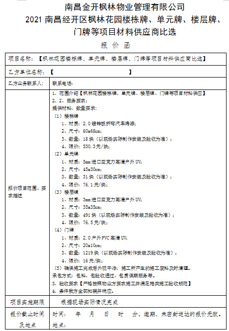 楓林花園樓棟牌、單元牌、樓層牌、門牌等項(xiàng)目材料供應(yīng)商比選