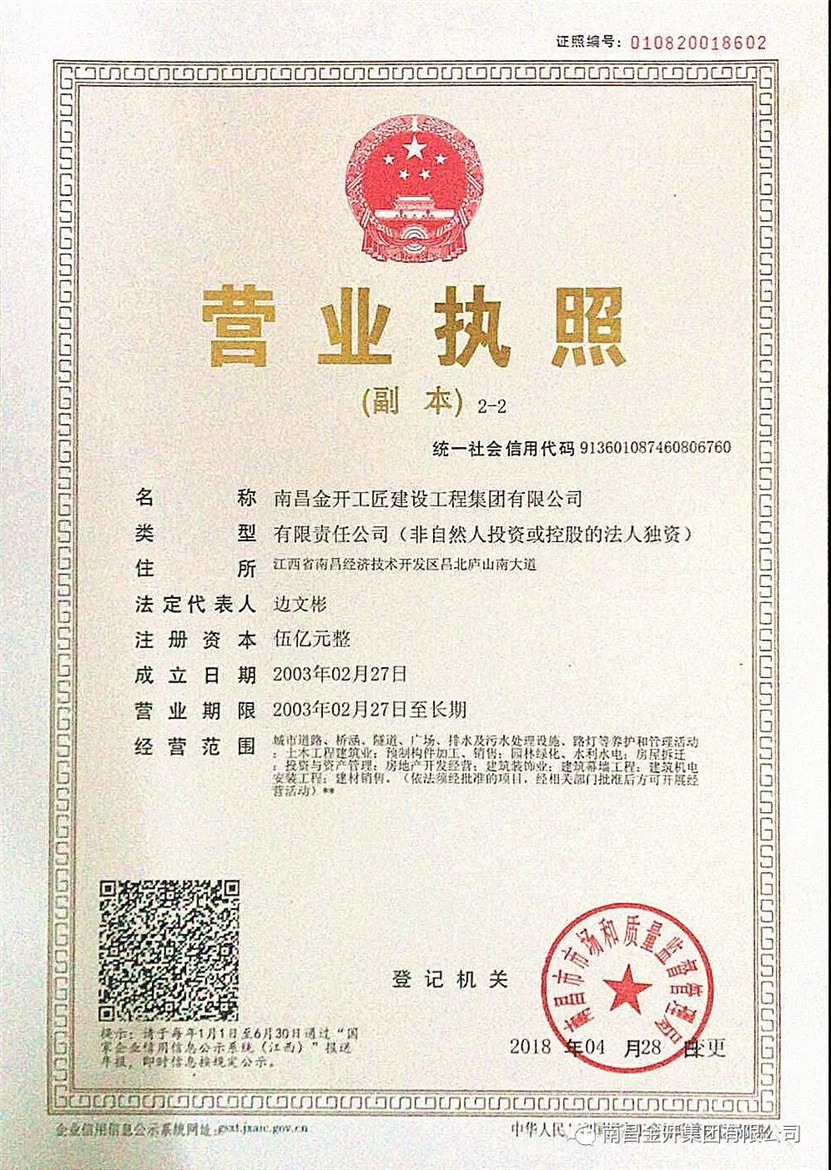 據(jù)悉,南昌金開工匠建設(shè)工程集團有限公司注冊資金伍億元,旗下?lián)碛形寮易庸荆揖哂惺姓こ淌┕た偝邪?,房建、土石方、城市及道路照明,園林綠化等多項資質(zhì)。