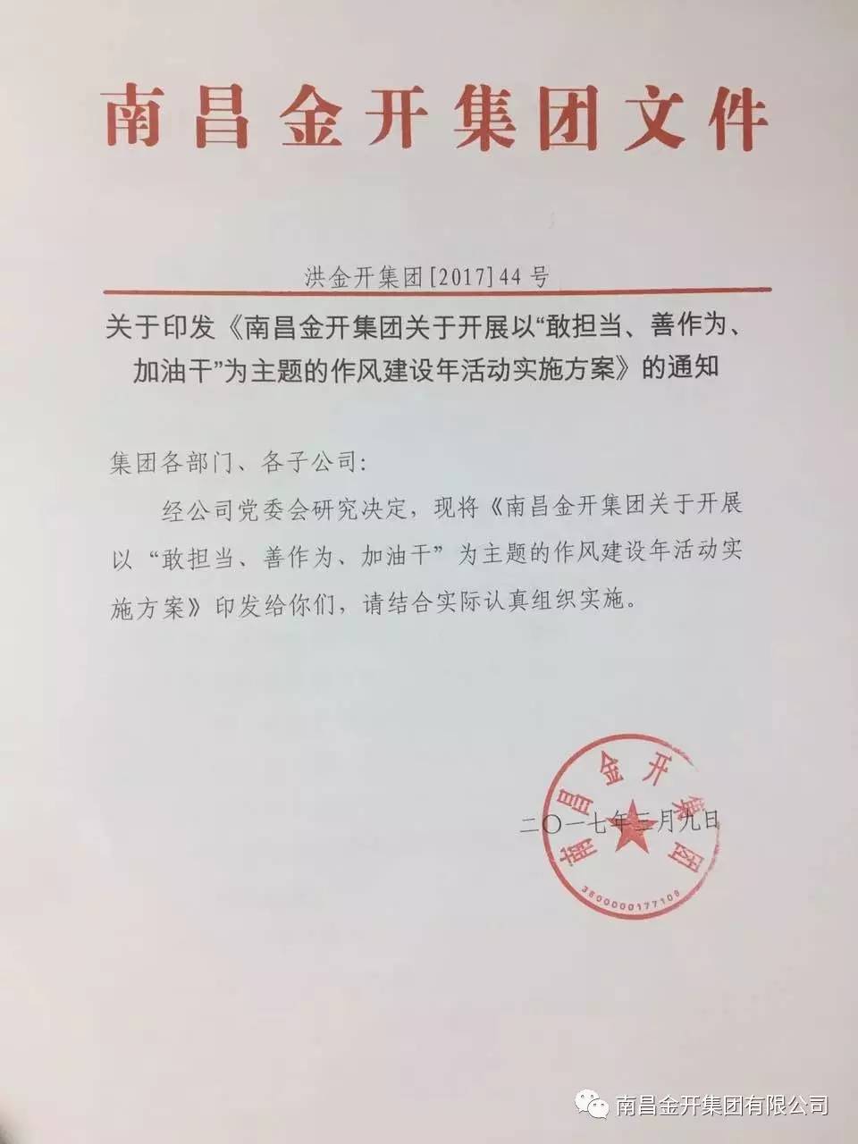 根據(jù)實施方案文件精神,集團監(jiān)察審計部制定了《南昌金開集團“敢擔當、善作為、加油干”作風建設年活動實施方案》。2017年擬在集團范圍內由集團監(jiān)察審計部牽頭開展“作風建設年”活動,主要解決“不作為、不善為、不快為”的三項問題,活動分為動員部署階段、推進實施階段、考核總結階段,要求集團各部門、各子公司高度重視,扎實推進各項工作。